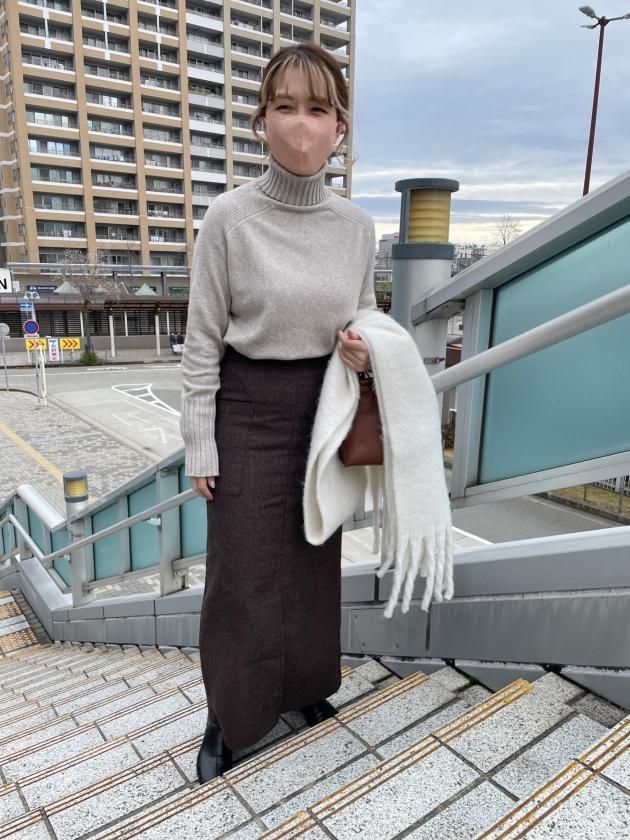すっきりと立ち上がるタートルネックで、顔回りも小さく見えるように工夫。
