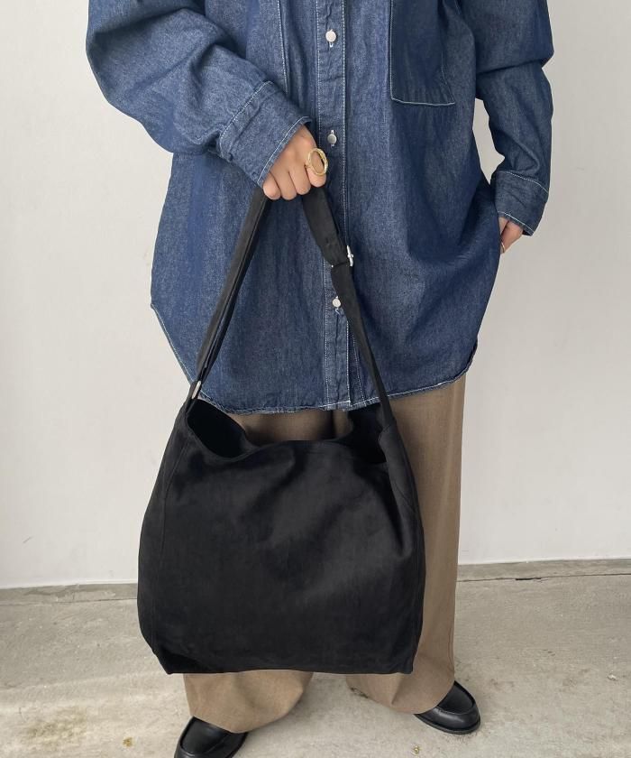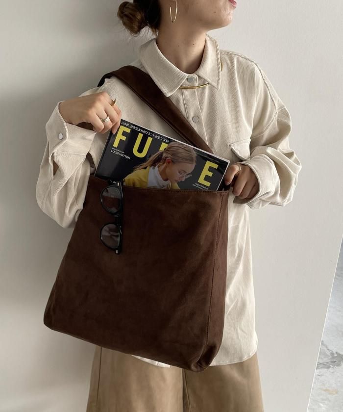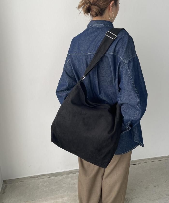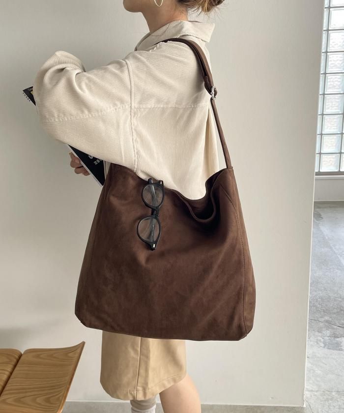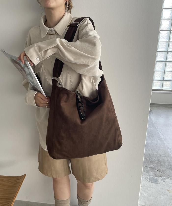 肌さわりの良い滑らかなフェイクスエードの大容量のショルダーバッグ。ワイドなマチとPCも入るサイズ感で通勤や通学、旅行など幅広いシーンで活躍。シンプルながらも存在感があり、カジュアルからきれいめまで合わせやすい万能デザイン。ショルダーストラップは長さ調節可能◎