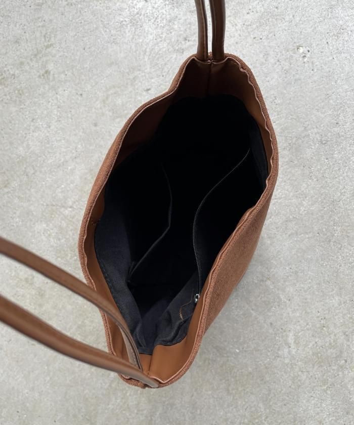本体:しっとりとした質感のフェイクスウェード素材、ポリエステル製で軽やかさと扱いやすさのある起毛素材です。ショルダー&チャーム:同色のフェイクレザーを使用しています。