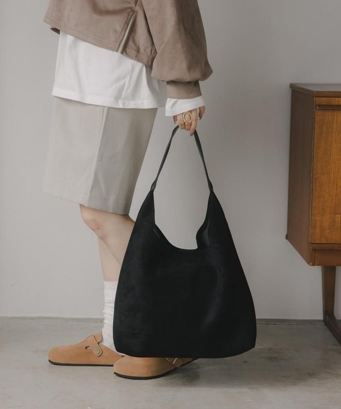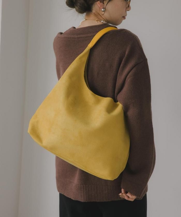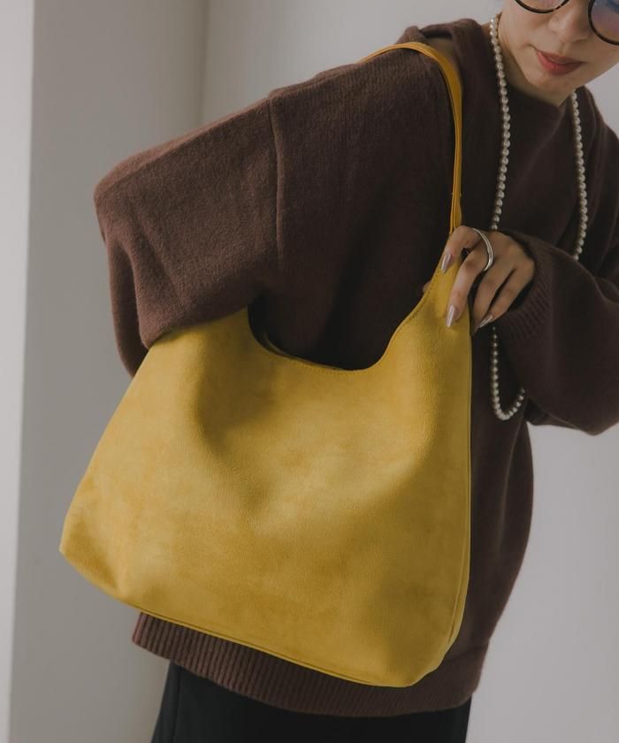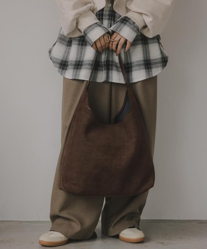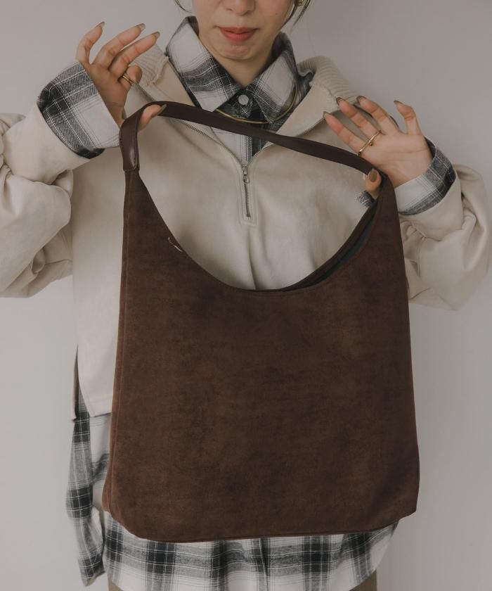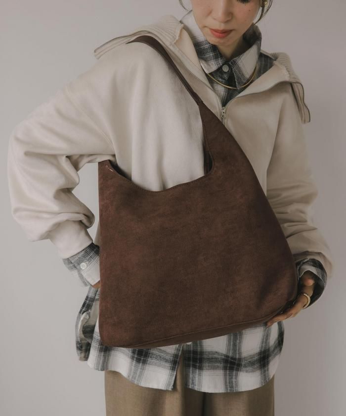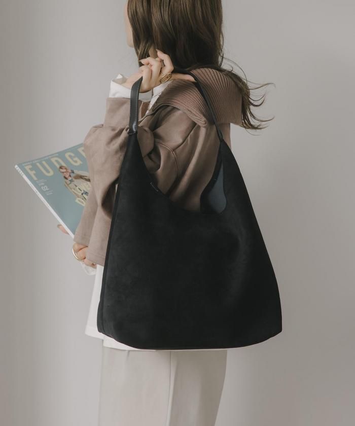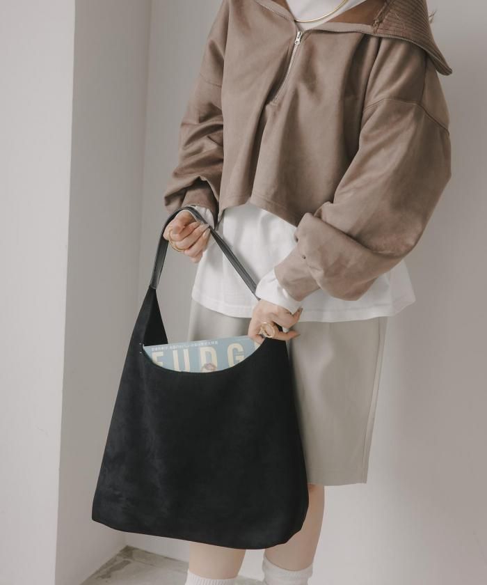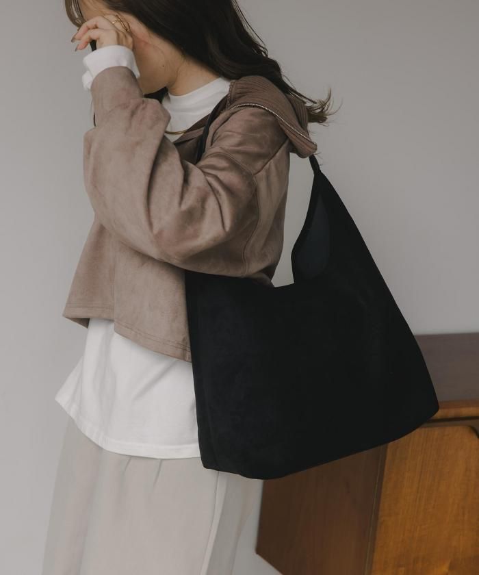 トレンド素材のスエードを使ったシーズンムード高まるショルダーバッグ。A4、PCもしっかり収納できるサイズ感でデイリーに使いたくなるバッグ。耐久性に考慮し、摩擦の多いショルダー部分にはフェイクレザーを使用しています。
