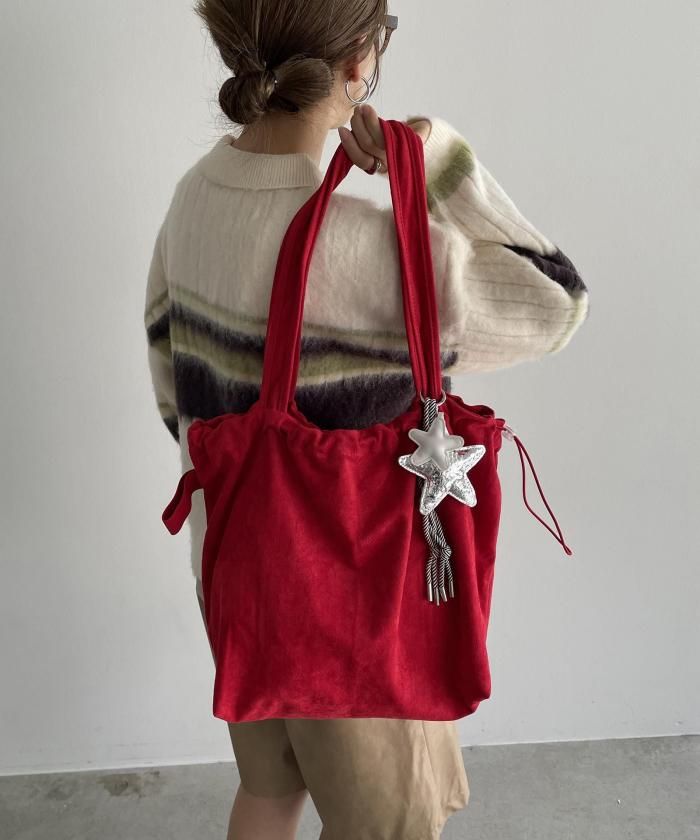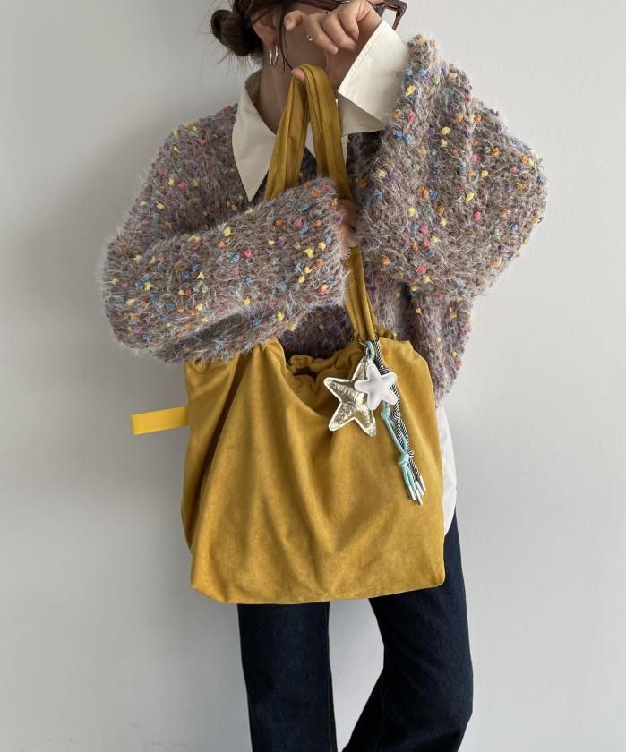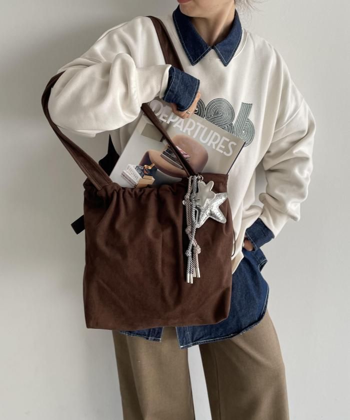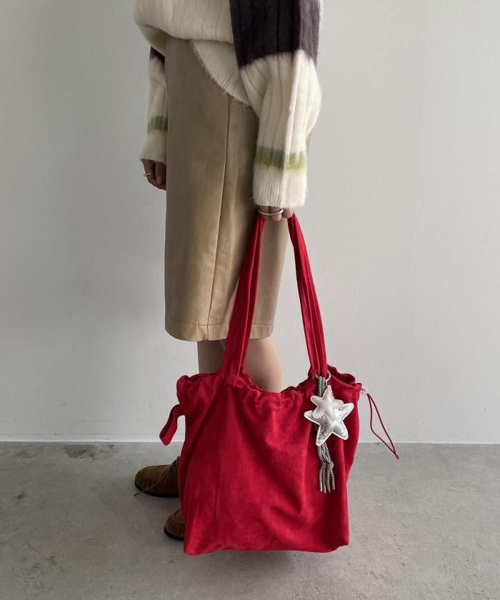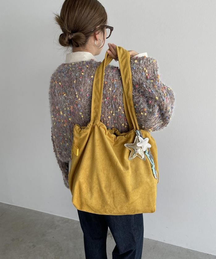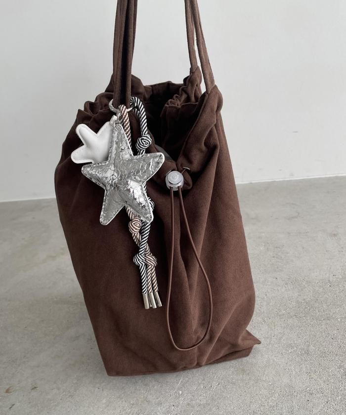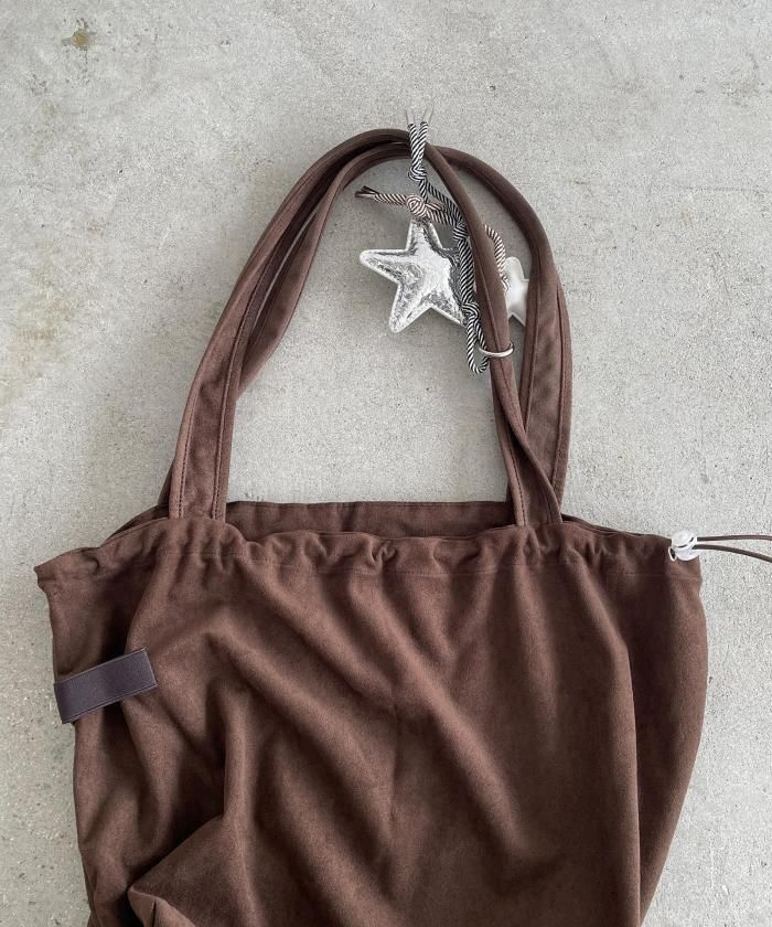 210NOUVEといえばの大人気ビッグ ロゴ ナイロン トートバッグと同じ形になります!これからの季節のコーデに差し色になるカラー展開とスターチャームが目をひく、A4サイズがすっぽり入るフェイクスエード素材のトートバッグ。起毛感のあるフェイクスエード素材はシーズンムードが高まるアイテム。開閉はドロストコードで紐をキュッと絞れば、ギャザーが寄って巾着型のような雰囲気にもなります。大きな荷物もすっぽり入り、とても便利!メインバッグとしてはもちろん、軽くて折りたたみもできるので、レジャーや旅行のサブバッグにもおすすめです!BAGの内側はファスナーポケット付き。