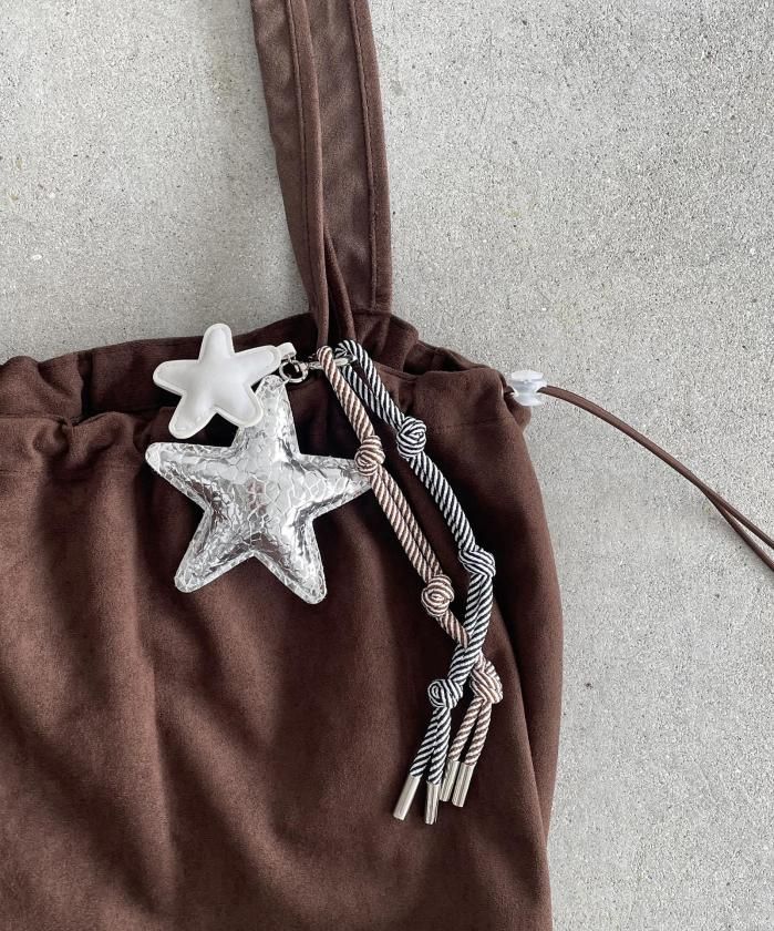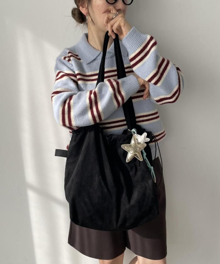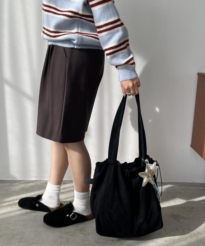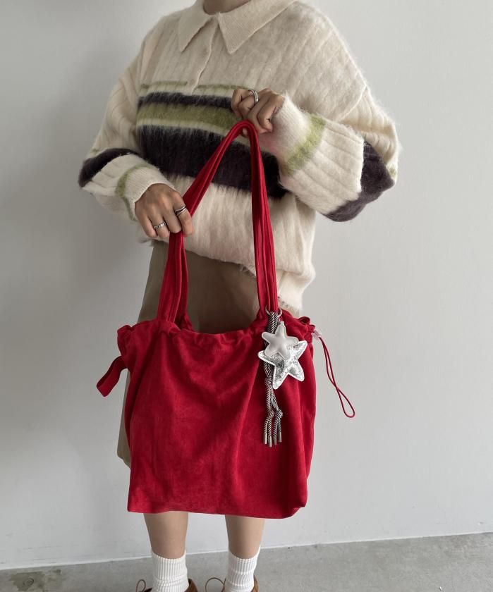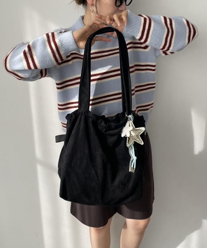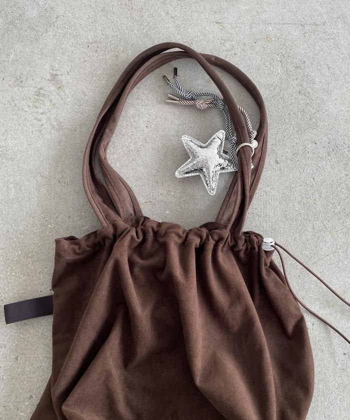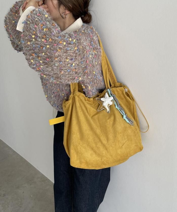 210NOUVEといえばの大人気ビッグ ロゴ ナイロン トートバッグと同じ形になります!これからの季節のコーデに差し色になるカラー展開とスターチャームが目をひく、A4サイズがすっぽり入るフェイクスエード素材のトートバッグ。起毛感のあるフェイクスエード素材はシーズンムードが高まるアイテム。開閉はドロストコードで紐をキュッと絞れば、ギャザーが寄って巾着型のような雰囲気にもなります。大きな荷物もすっぽり入り、とても便利!メインバッグとしてはもちろん、軽くて折りたたみもできるので、レジャーや旅行のサブバッグにもおすすめです!BAGの内側はファスナーポケット付き。